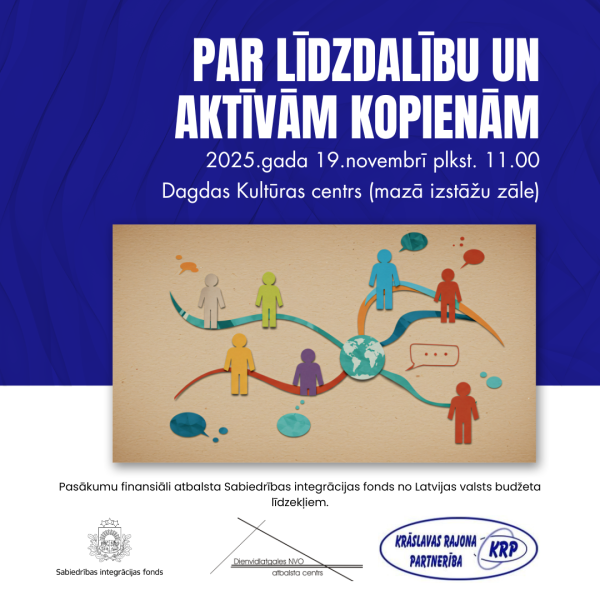 Krāslavas rajona partnerība aicina Dagdas pilsētas un apkārtējo pagastu iedzīvotājus un biedrības uz tikšanos 19.11.2025., plkst. 11:00, Dagdas Kultūras centrā. Tikšanās laikā runāsim par Līdzdalības budžeta iespējām Krāslavas novadā un sabiedriskā labuma projektiem NVO.